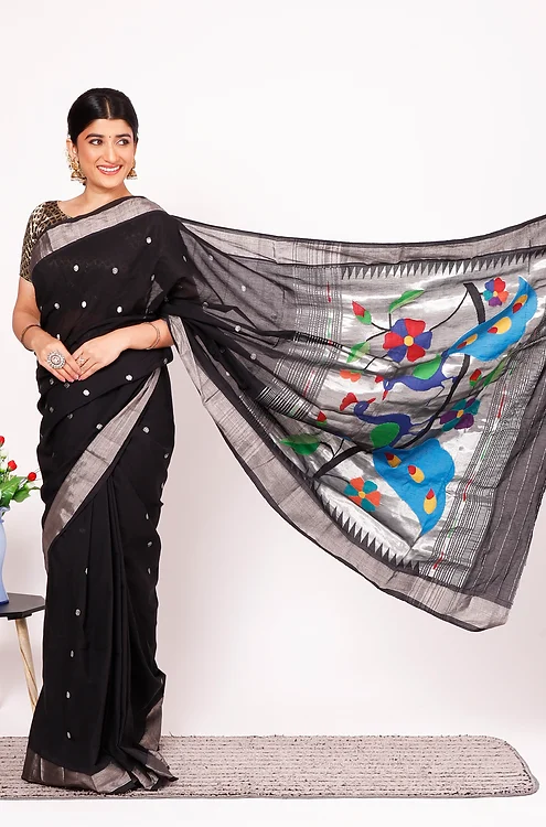 Handloom Pure Cotton Paithani Saree – Black with Silver Border & Peacock Pallu