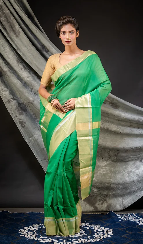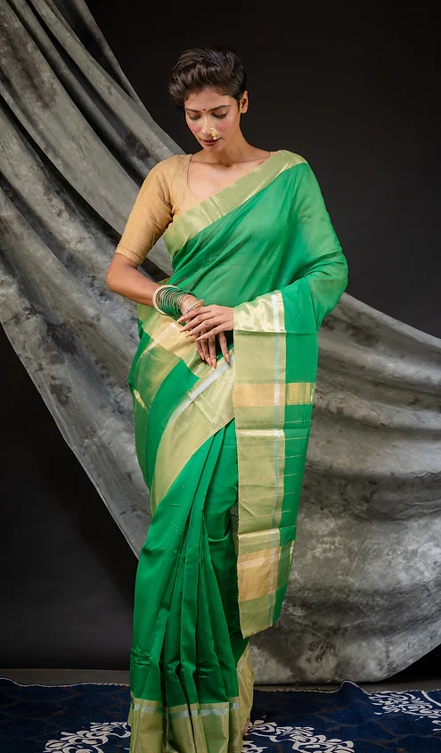 Green Handloom Cotton Silk Chanderi Saree with Golden Zari Border – Traditional Festive Wear for Women