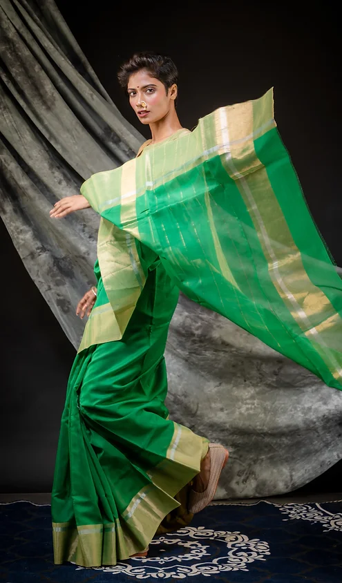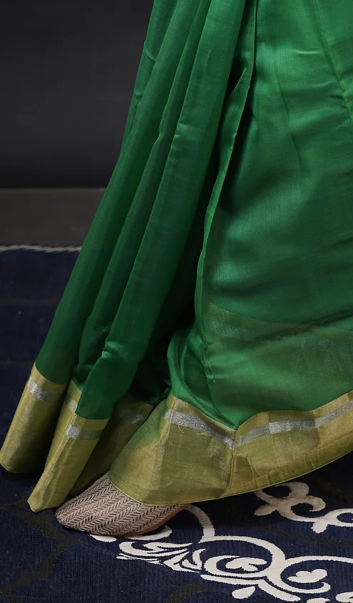 Pair this green Chanderi saree with a golden blouse and statement jewelry for weddings and celebrations, or style with pearls for a sophisticated day look.