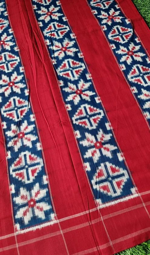 Step into the elegance of Indian tradition with this Handloom Pure Cotton Double Ikat Saree, an authentic masterpiece from Pochampally, Telangana. Designed using the traditional double ikat weaving technique, the saree showcases a striking blue body adorned with red and white ikat motifs, finished with a bold red border that adds to its grace.