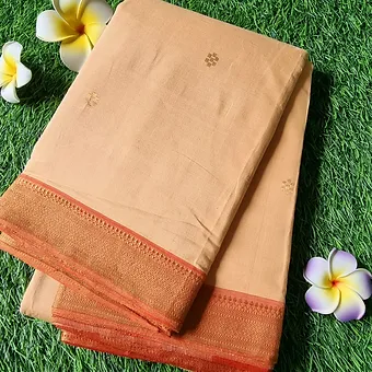 Lightweight, breathable, and comfortable to drape, this saree is crafted from premium cotton-silk handloom fabric. The Nizam border, with its intricate golden zari work, makes it a perfect choice for weddings, religious ceremonies, festive gatherings, and cultural events.