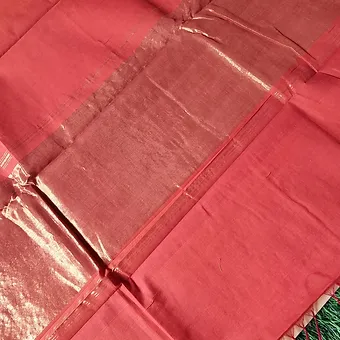 - Pallu: Red zari pallu with intricate detailing