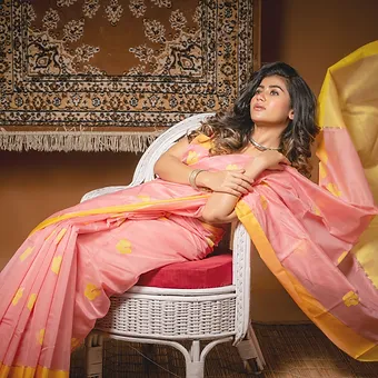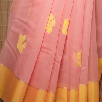 Color: Light peach-pink with contrasting yellow zari border & motifs