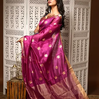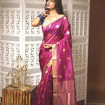 • Bold magenta silk saree with rich golden detailing