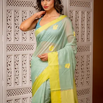 Pastel Green Handloom Cotton Silk Chanderi Saree with Yellow Zari Border & Motifs