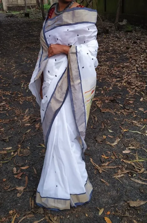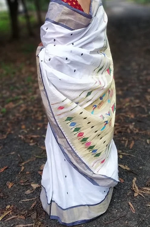 Handloom Pure Cotton Paithani Saree – White with Grey Border & Multicolor Pallu