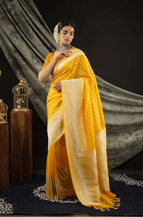 The Yellow Handloom Khadi Georgette Banarasi Saree is a stunning creation that blends the richness of Banarasi craftsmanship with the lightness of khadi georgette fabric. Handwoven with precision, this saree features intricate zari work across its drape, complemented by a striking yellow hue that exudes grace and festivity.